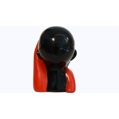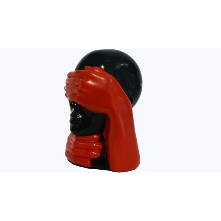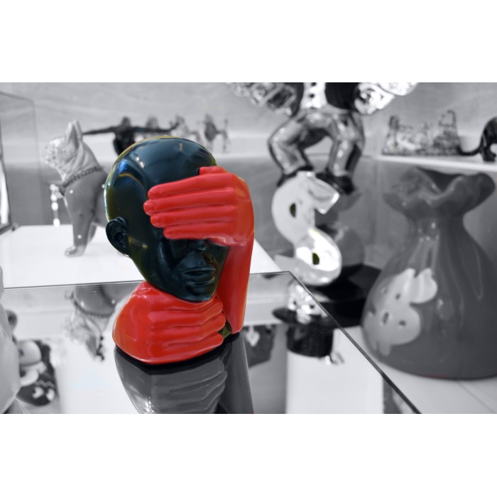 A serious and bold sculpture of a human head being held by two arms in a dramatic posture. With art deco aesthetics and contrasting two colored palette this piece will add dramatic vibe to your space of choice.