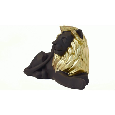 A bold sculpture in art deco style of a lion in a resting posture. with its matt black color and glistening golden mane this lion will add great style and confidence to your space.