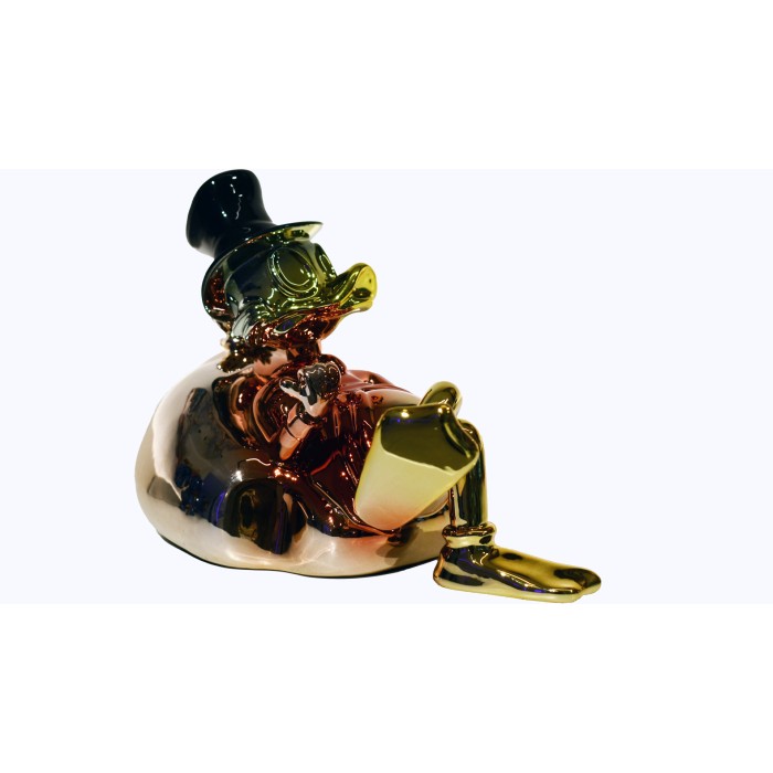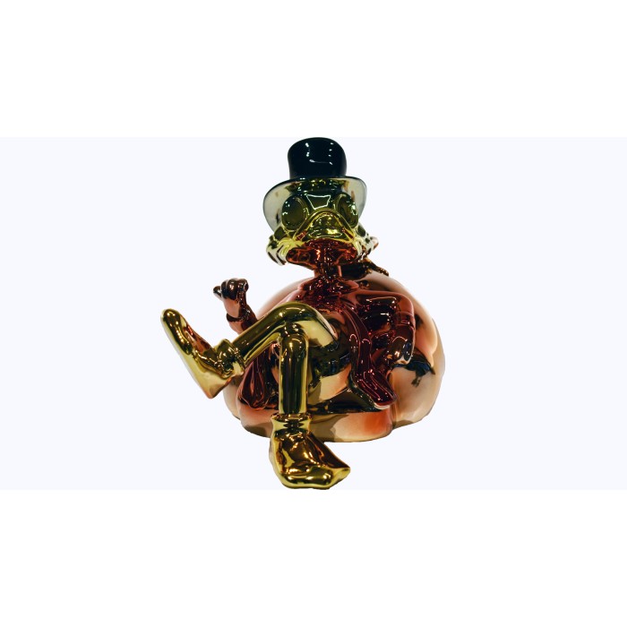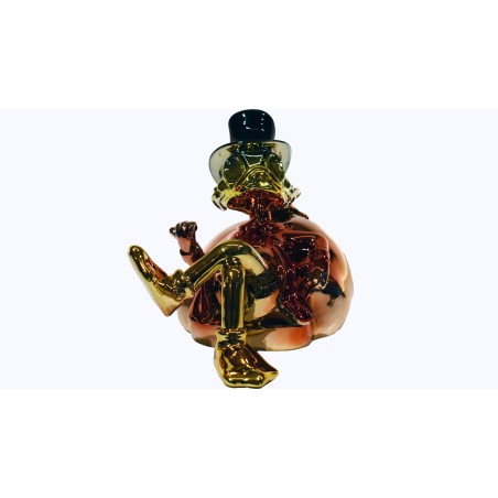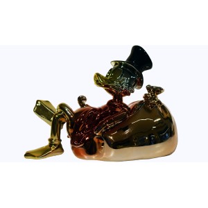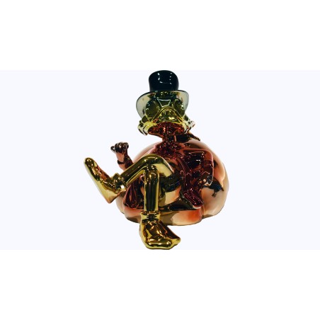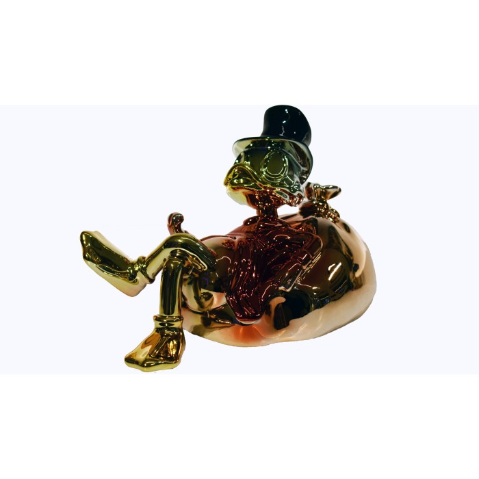A wonderful and impressive piece depicting the richest uncle of all and that's none other than Scrooge Mc Duck. With his signature gentleman hat and robes he rests on this huge sack of money. The electroplating finish and its contrasting color gradients will make this piece stand out in any space of room you choose to play it.