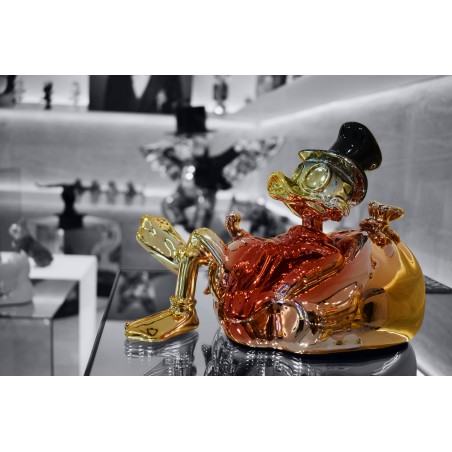 A sculpture depicting Scrooge Mc Duck holding bottles of Dom Perignon and Moet.